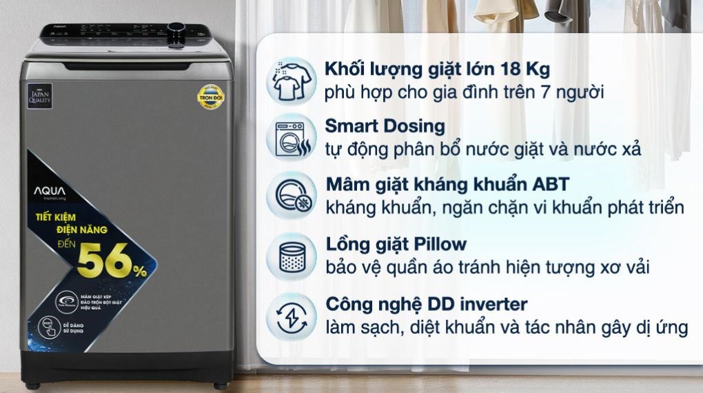 Máy giặt Aqua Inverter 18 kg AQW-DR180UHT PS thuộc dòng máy giặt lồng đứng với đa dạng các công nghệ như tiết kiệm điện với công nghệ DD Inverter, an toàn với sức khỏe nhờ có mâm giặt kháng khuẩn của ABT và tính năng đặc biệt là Smart Dosing tự động phân bổ nước giặt và nước xả tiện lợi.
