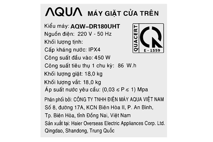 - Tiện ích: Vệ sinh lồng giặt Van sử dụng mực nước thấp Khóa trẻ em Hẹn giờ giặt