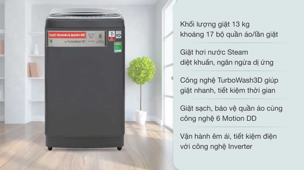 Máy giặt LG Inverter 13 kg TH2113SSAK tự tin có thể làm hài lòng bất kỳ vị gia chủ khó tính nào nhờ các tính năng vô cùng tiện ích như chuyển động thông minh, giảm nhăn quần áo,... cho hiệu quả giặt sạch tối ưu kèm theo khả năng tiết kiệm điện nước mạnh mẽ và bền bỉ, sản phẩm hoàn toàn xứng đáng được liệt kê vào các dòng máy đáng mua cho gia đình bạn.