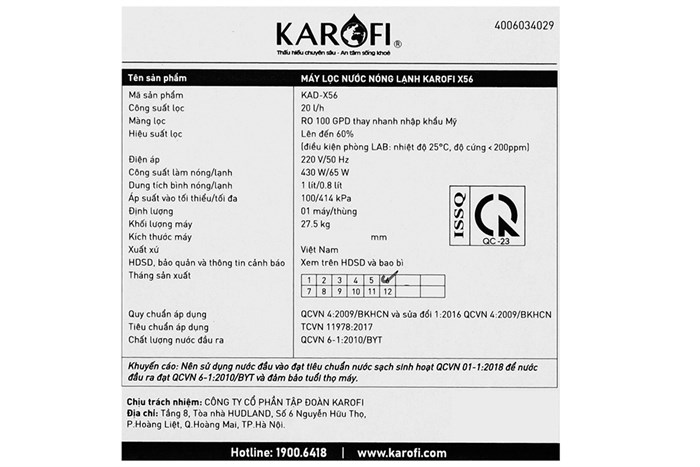 Máy lọc nước RO nóng nguội lạnh Karofi KAD-X56 trang bị 11 lõi lọc, màng lọc RO Purifim 100 GPD sản xuất tại Mỹ đảm bảo chất lượng, công nghệ kháng khuẩn Nano Silver cùng nhiều tiện ích như: ngừng hoạt động khi áp lực nước thấp, tự động xả nước thải,... đây chắc chắn là một thiết bị lọc nước nên có mặt trong mọi gia đình.